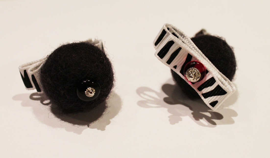 Oba pierścionki wykonane są z filcowych kul (30 mm), rypsowej wstążki (10 mm), akrylowych przekładek (8 mm) oraz metalowych szpilek z ozdobnymi końcówkami. Podstawy metalowe o regulowanych obrączkach.